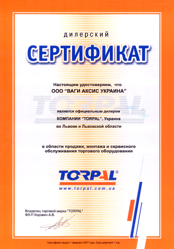 Сертификат официального дилера "Torpal" |