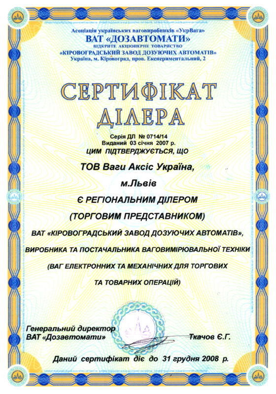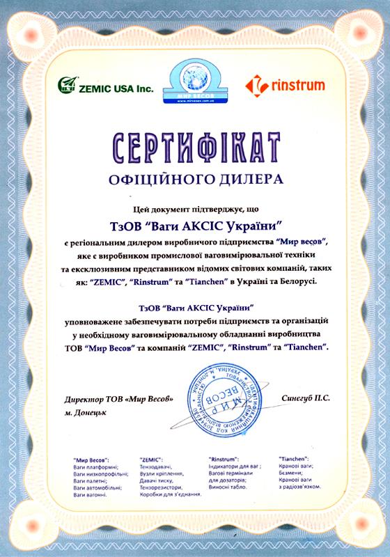Сертификат официального дилера "Мир Весов" |
