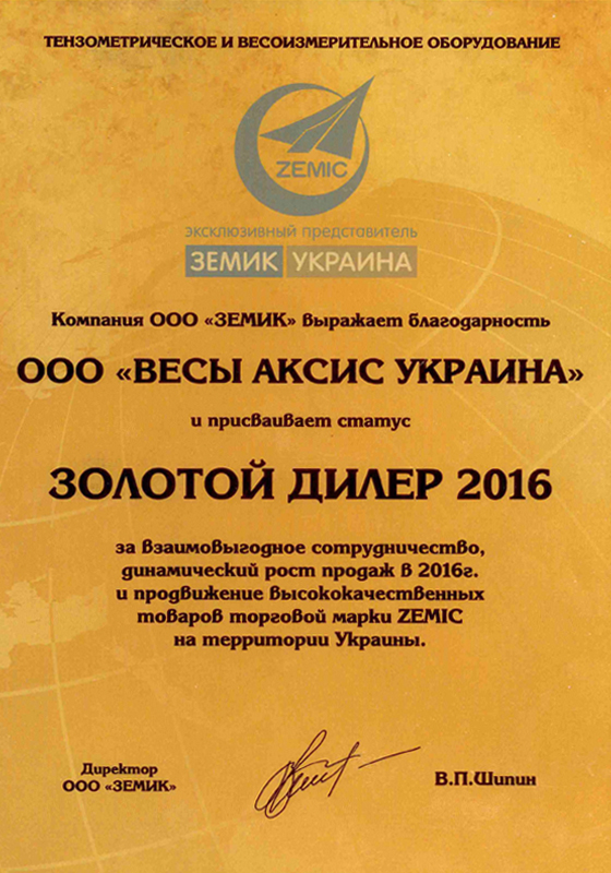 Диплом "Мир Весов Киев Золотой дилер-2016" |