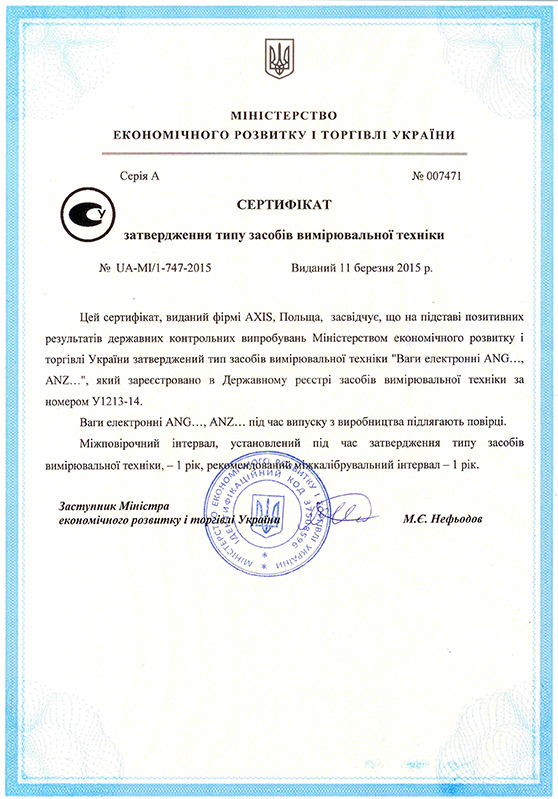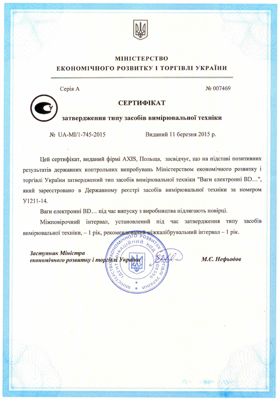 Сертификат утверждения типа "Весы автомобільні електронні АКСІС" |